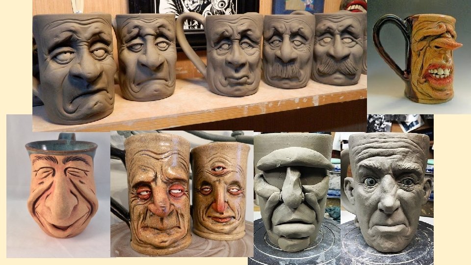 Face Mugs -Requirements • • • Functional 1 -2 facial expressions 1 -2 handles (pulled or coiled) Facial features are realistic Slab built Dimensions: 5”- 8” in height Sketchbook Requirements: • • 2 different ideas = 2 mugs with different facial expressions Dimensions Process/plan written out Colored (no more than 3 colors)