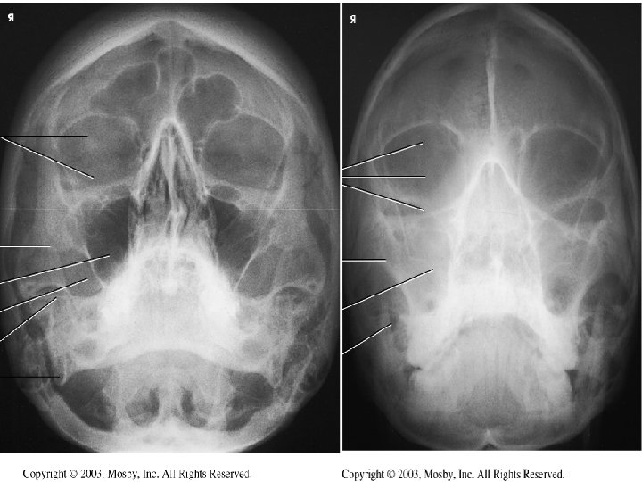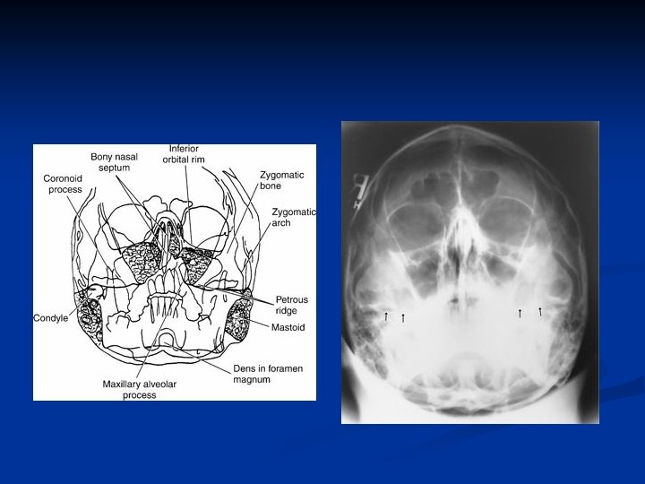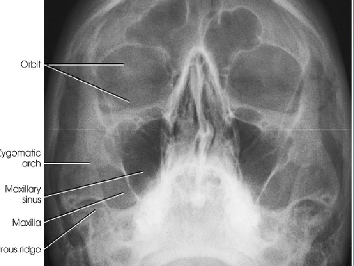 Waters Radiograph n Distance from lateral border of skull and orbit equal on each side n Petrous ridges projected immediately below maxillary sinuses