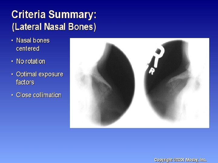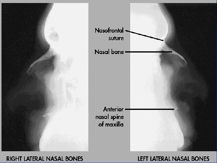 Lateral Nasal bones Radiograph n No rotation of nasal bone and soft tissue n Anterior nasal spine and frontonasal suture evident n Close collimation