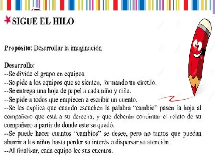 � Proponer una oración que dé comienzo al relato. Algo tan sencillo como ‘Una mañana de verano…’; ‘La luz se apagó y…’; ‘Durante mis últimas vacaciones…’; ‘El coche apareció tras la esquina…’. � Sugerir ciertas palabras (lluvia, rojo, perro, calcetín, etc. ) que deben incluirse en un texto de determinadas líneas. � Utilizar un tema de la vida diaria y describirlo: cómo llega a la escuela, cómo es su habitación, qué hace durante el recreo, a qué dedica las tardes, cómo es su mascota, si tiene algún lugar favorito…