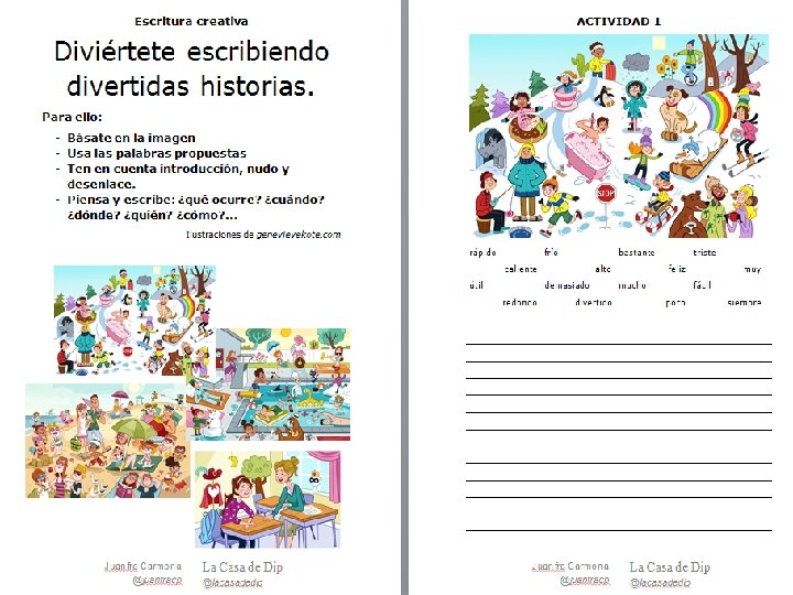 Historias en bolsas de papel Se trata de combinar personajes, argumentos y escenarios que puedan dar pie a historias muy diferentes. Solo necesitamos tres bolsas de papel. ¿Cómo hacerlo? Cada bolsa tendrá un color diferente y un nombre propio: personaje, argumento y escenario. ● Haremos una lluvia de ideas con frases y palabras que puedan incluirse en cada una de las bolsas. Los chicos escribirán sus ideas en trozos de papel que irán introduciendo en las bolsas. ● Organizaremos la clase en grupos de 3 o 4 alumnos. Cada grupo cogerá un papel de cada bolsa y tendrá que crear colaborativamente una historia a partir de los elementos que le hayan ● ¡Es muy divertido porque se producen las combinaciones más inesperadas! (Por ejemplo, “Un atolondrado boli se convierte en detective en un bosque”).