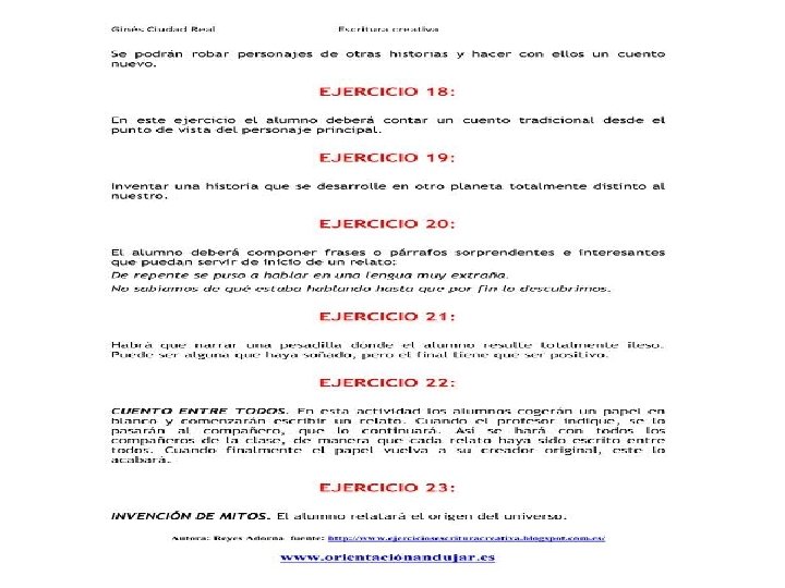 6. Clásicos inspiradores Se trata de usar los comienzos de algunos de los mejores libros de la historia para empezar nuestros relatos. Cómo hacerlo Copiamos los primeros párrafos de distintos libros clásicos y los repartimos por clase. Los alumnos tendrán que partir de esos párrafos para continuar las historias. ● Podemos dejar que cada uno elija el fragmento que más le llame la atención o repartirlos nosotros. ● El texto puede ser redactado individualmente o en equipos de dos o tres personas. ● El enlace 50 comienzos literarios nos proporciona recursos para esta actividad. ●