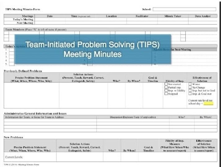 TIPS Offers: A process for using data to make decisions: A structured meeting process • Formal problem solving steps that a group can use to build and implement solutions. • Access to the right information at the right time in the right format • Formal roles (facilitator, recorder, data analyst) • Specific expectations (before, during & after meetings) • Access and use of data • Use of electronic and projected meeting minutes