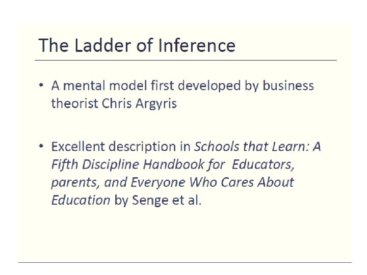 Ladder of Inference • • • I take: actions (based on beliefs) I adopt: beliefs (about the world) I draw: conclusions I make: assumptions (based on meaning added) I add: meanings (cultural and personal) I select: “Data” (from what I observe) Observable “data” and experiences start here.