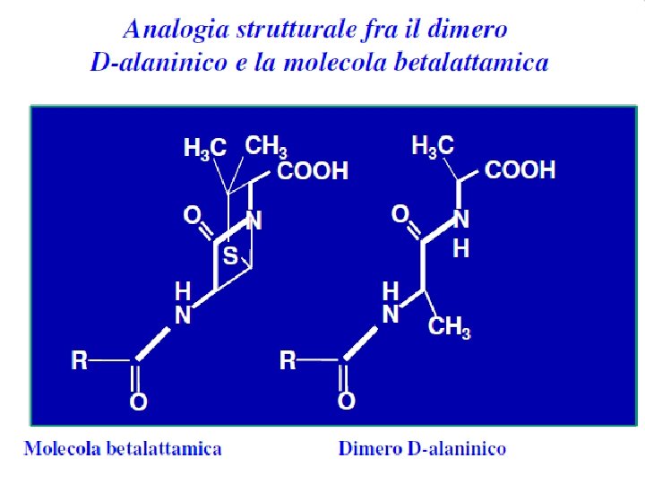 Le -lattamine inibiscono sintesi della parete celulare batterica • Inibiscono irreversibilmente gli enzimi coinvolti nella fase finale della sintesi della parete • Si tratta degli enzimi che mediano la formazione dei ponti peptidici leganti i petptidoglicani adiacenti • L’anello -lattamico dei farmaci è strutturalmente simile al substrato dell’enzima • Il legame inibetente l’attività enzimatica è di tipo competitivo