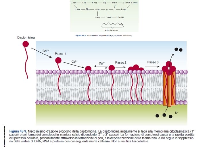 ALTRI ANTIBATTERICI CHE AGISCONO SULLA PARETE (Vanco-Teico)o SULLA MEMBRANA (Dapto) CELLULARE GLICOPEPTIDI Vancomicina (generico, Vancotex®, ecc. , os e infusione ev) Attività esclusiva verso batteri G+ in particolare stafilococchi. E’ irritante per i tessuti e quindi provoca flebiti. Raramente ototossicità e nefrotossicità. Tra le reazioni più comuni c’è la sindrome dell’uomo rosso o del collo rosso, legata a rilascio di istamina (evitabile prolungando il tempo di infusione) Teicoplanina (Targosid®, parenterale) Simile alla vancomicina, lunga emivita generalmente si somministra una volta al giorno LIPOPEPTIDI Daptomicina (Cubicin®, infusione ev) Spettro d’azione simile alla vancomicina, ma attiva anche su enterococchi e ceppi di S. aureus resistenti alla vancomicina.
