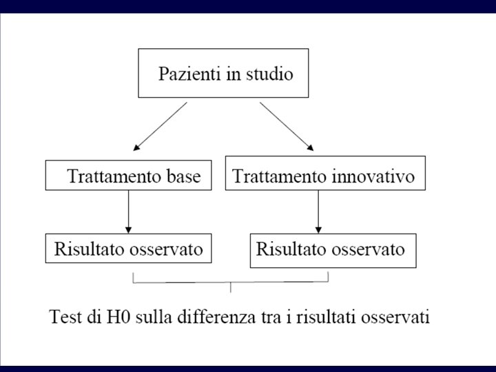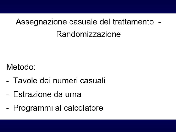 Randomizzazione (random = a caso) Ø Rappresenta, assieme al controllo, la caratteristica fondamentale dei trial clinici Ø I pazienti, reclutati sulla base dei criteri di inclusione ed esclusione stabiliti a priori, vengono assegnati al trattamento sperimentale o a quello di controllo mediante una forma più o meno sofisticata di sorteggio (ad esempio generazione da parte di un computer di sequenze numeriche casuali) Ø La procedura di randomizzazione deve essere tale da rendere imprevedibile a quale trattamento verrà assegnato il paziente successivo, non sono accettabili procedure basate sulla data di nascita, sul giorno del ricovero, sul reparto di degenza, ecc. Ø Con la randomizzazione si riescono ad ottenere (almeno teoricamente) gruppi omogenei tra di loro per tutte le caratteristiche note ed ignote (es. età, sesso, gravità patologia, abitudini di vita, ecc. ) Ø L’omogeneità tra i gruppi sarà maggiore anche in relazione alla numerosità del campione