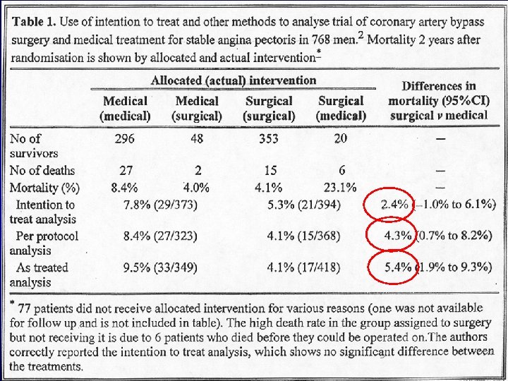 Analisi dei risultati Intention to treat: i risultati vengono analizzati tenendo conto anche dei soggetti che si intendevano trattare e che per qualche motivo non sono stati trattati In questo modo la randomizzazione è l’unico elemento che determina la formazione dei gruppi Fornisce una stima pragmatica del beneficio di un intervento piuttosto che dei potenziali benefici nei pazienti che lo ricevono effettivamente Si può applicare solo quando sono disponibili i dati di esito per tutti i soggetti randomizzati Molti trials mancano dei dati sugli esiti e l’analisi dei risultati spesso non è descritta né applicata adeguatamente (vedi esempio diapositiva successiva)