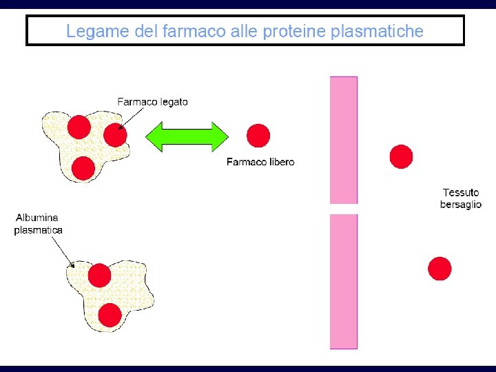 Legame alle proteine • Soprattutto alle albumine • Il farmaco legato non attraversa le membrane • Equilibrio continuo tra parte libera e legata
