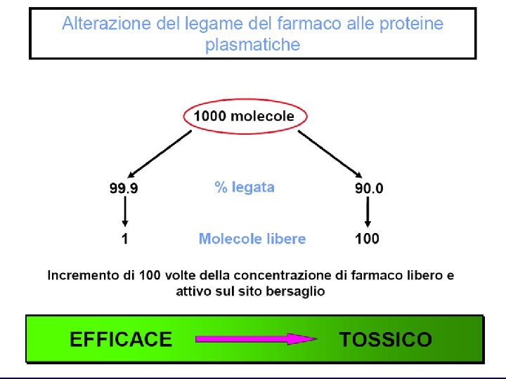 Legame farmaco-proteine 50% legato 90% legato Farmaco libero (5) Farmaco libero (1) Farmaco legato (5) Farmaco legato (9) Farmaco totale (10)