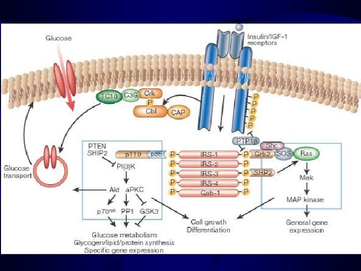 Attivazione del recettore dell’insulina Insulin binding to a subunit regulates b subunit activity Insulin GLUT 4 autophosphorylation of b subunit tyr kinase activity phosphorylation of other substrates phosphorylation of MAP kinase PO 4 IRS-1 + ATP IRS-1 -PO 4 e. g. GLUT expression MAPK-PO 4 + ATP Transcriptional regulation Protein synthesis, proliferation & differentiation