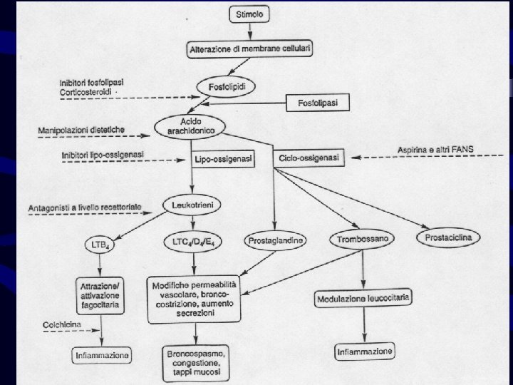 LE FOSFOLIPASI A 2 Forma extracellulare di 14 k. D: secreta da cellule infiammatorie stimolate da citochine; attiva sulla stessa cellula che l'ha secreta e su contigue IMPORTANTE PERCHE’ TARGET MOLECOLARE DEL MECCANISMO ANTI-INFIAMMATORIO DEI FARMACI ANTI-INFIAMMATORI STEROIDEI (glucocorticoidi via produzione di lipocortina-1) Forma citoplasmatica di 85 k. D: traslocata alla membrana da aumenti della [Ca 2+]i; non inibita dalla lipocortina-1