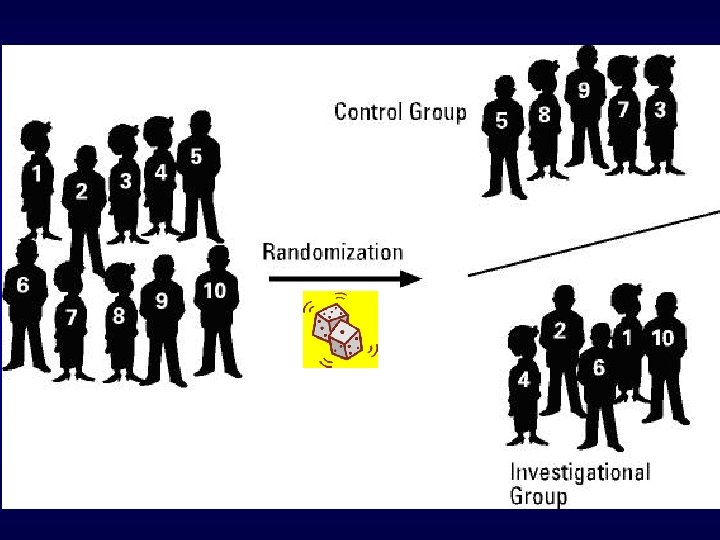 Randomizzazione (random = a caso) Ø Rappresenta, assieme al controllo, la caratteristica fondamentale dei trial clinici Ø I pazienti, reclutati sulla base dei criteri di inclusione ed esclusione stabiliti a priori, vengono assegnati al trattamento sperimentale o a quello di controllo mediante una forma più o meno sofisticata di sorteggio (ad esempio generazione da parte di un computer di sequenze numeriche casuali) Ø La procedura di randomizzazione deve essere tale da rendere imprevedibile a quale trattamento verrà assegnato il paziente successivo Ø Con la randomizzazione si riescono ad ottenere (almeno teoricamente) gruppi omogenei tra di loro per tutte le caratteristiche note ed ignote (es. età, sesso, gravità patologia, abitudini di vita, ecc. ) Ø L’omogeneità tra i gruppi sarà maggiore anche in relazione alla numerosità del campione