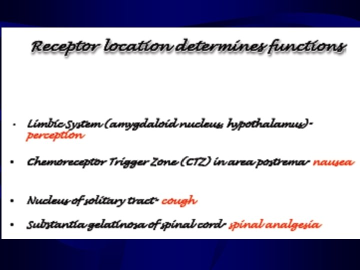 RECETTORI PER GLI OPPIOIDI RECETTORI RISPOSTA DOPO ATTIVAZIONE Mu ( ) o MOR Analgesia sopraspinale, spinale , peroferica depressione respiratoria, miosi, sedazione, euforia, ridotta motilità gastrointestinale, bradicardia, dipendenza fisica Kappa ( ) o KOR Analgesia solo spinale, sedazione, effetti psicomimetici, depressione respiratoria (minore rispetto ai recettori mu) Delta ( ) o DOR analgesia (poco chiara nell’uomo), miosi, effetti GI Sono tutti recettori accoppiati alle proteine G