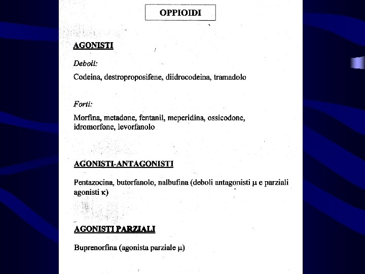 USI TERAPEUTICI DEGLI OPPIOIDI • Dolore moderato o severo, in particolare dolore neoplastico o post-chirurgico • Edema polmonare (morfina per alleviare la dispnea= meccanismo non chiaro) • Tosse (destrometorfano, non provoca analgesia nè dipendenza) • Diarrea (esistono vari antidiarroici non oppioidi come alternativa)