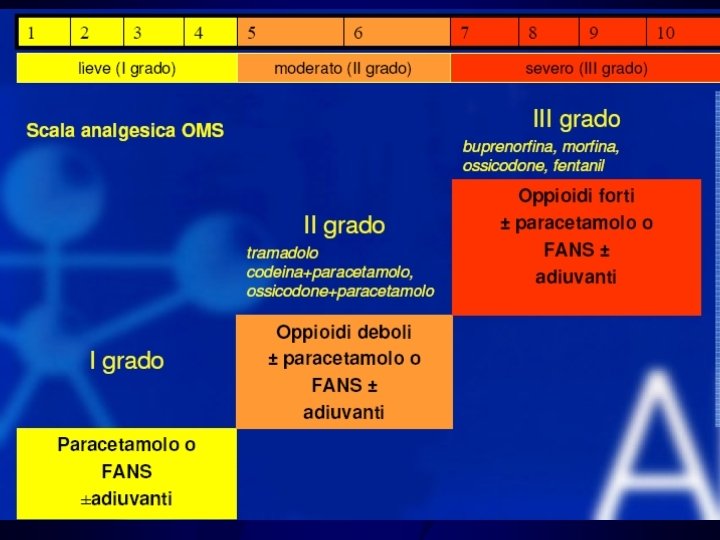 ALCUNI DATI SUL DOLORE NEOPLASTICO DALLA LETTERATURA INTERNAZIONALE 30 -40% dei pazienti affetti da neoplasia presentano dolore al momento della diagnosi 65 -85% dei pazienti con malattia avanzata hanno dolore 85 -95% dei pazienti potrebbe ottenere un adeguato controllo del dolore con una corretta terapia farmacologica