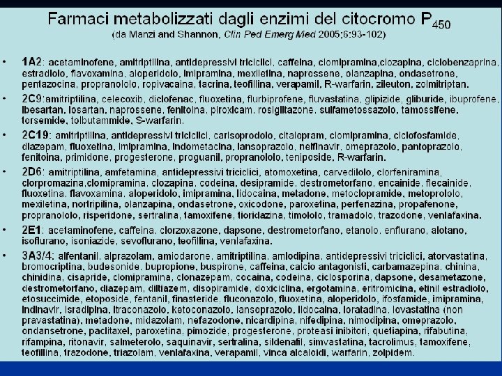Percentuale dei farmaci metabolizzati dagli enzimi appartenenti alla classe del citocromo P 450 CYP 3 A 4 (36%, secondo alcune stime potrebbero superare il 50%) CYP 2 D 6 (19%) CYP 2 C 19 CYP 2 C 9 CYP 1 A 2 CYP 2 E 1 CYP 2 B 6 CYP 2 A 6
