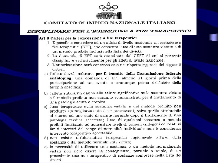 Sostanze proibite in particolari discipline sportive P 1 Alcool*, es. automobilismo (>0. 10 g/L), arco (>0. 10 g/L), biliardo (>20 g/L), karate (>0. 10 g/L), ecc. P 2 Beta-bloccanti* (es. atenololo, labetalolo, metoprololo, nadololo, sotalolo, timololo, ecc. ) in diversi sport (es. automobilismo, arco**, bridge, ginnastica, nuoto sincronizzato, ecc. ) *solo in competizione, **anche fuori competizione