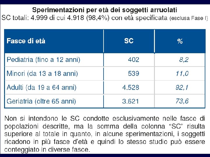 Rappresentatività del campione Ø I risultati di uno studio sono estrapolabili solo a pazienti simili a quelli reclutati Ø Criteri di inclusione troppo rigidi non permettono di sapere se l’intervento in sperimentazione avrebbe gli stessi risultati nella popolazione Ø Problema donne in gravidanza, ultra anziani, bambini, spesso esclusi dalle sperimentazioni ma poi trattati quando i farmaci entrano in commercio