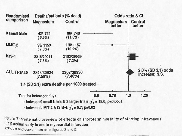 Dai trials clinici ai mega-trials (un esempio) Magnesio nell’infarto miocardico Razionale: variazione nell’andamento di patologie cardiache in funzione della quantità di magnesio nell’acqua Studi su animali hanno mostrato l’attività antiaritmica, antiaggregante e coronarodilatatrice del magnesio Piccoli trials positivi sull’uso del magnesio nell’infarto Una review informale dei risultati ha mostrato una riduzione della mortalità da IMA (infarto acuto del miocardio) Una meta-analisi formale su 1300 pazienti con un totale di 78 decessi ha mostrato una riduzione del 55% nel rischio di morte (p=0. 001) Studio LIMIT-1 su 100 paz. aritmie (1986) Studio LIMIT-2 su 2300 paz. incidenza di insuff. ventricolare sinistra (1994)