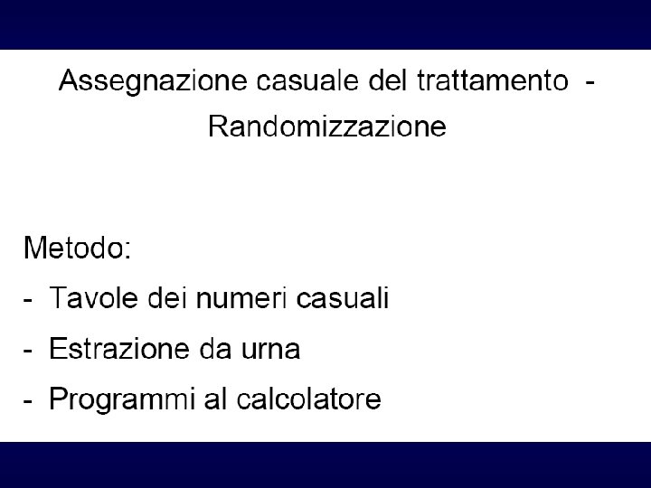 Randomizzazione (random = a caso) Ø Rappresenta, assieme al controllo, la caratteristica fondamentale dei trial clinici Ø I pazienti, reclutati sulla base dei criteri di inclusione ed esclusione stabiliti a priori, vengono assegnati al trattamento sperimentale o a quello di controllo mediante una forma più o meno sofisticata di sorteggio (ad esempio generazione da parte di un computer di sequenze numeriche casuali) Ø La procedura di randomizzazione deve essere tale da rendere imprevedibile a quale trattamento verrà assegnato il paziente successivo Ø Con la randomizzazione si riescono ad ottenere (almeno teoricamente) gruppi omogenei tra di loro per tutte le caratteristiche note ed ignote (es. età, sesso, gravità patologia, abitudini di vita, ecc. ) Ø L’omogeneità tra i gruppi sarà maggiore anche in relazione alla numerosità del campione