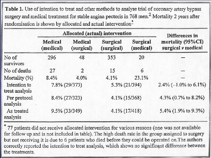 Molti trial clinici, ancora oggi, non sono analizzati in base all’intention to treat Randomised controlled trials identified for assessment Journal No of trials No (%) reporting intention to treat BMJ 42 18 (43) JAMA 35 15 (43) Lancet 84 45 (54) N Engl J Med 88 41 (47) Total 249 119 (48)