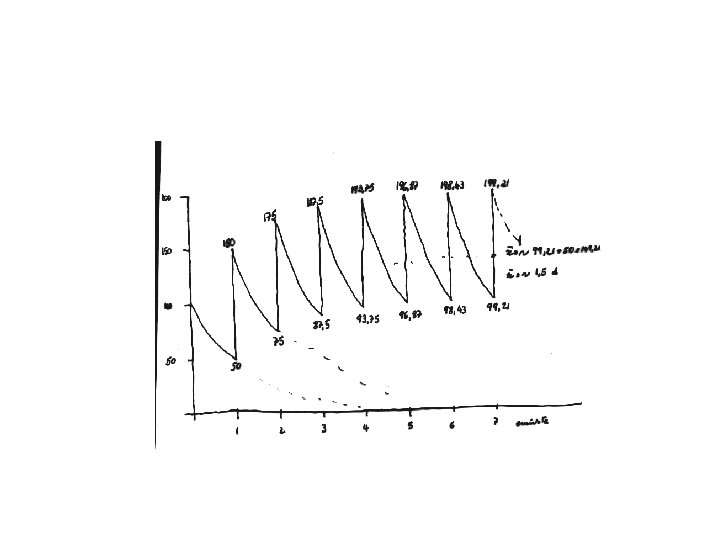 Se si procede con lo stesso ritmo di somministrazione la terza dose si somma agli avanzi della seconda e agli avanzi (più piccoli) della prima e via dicendo. E’ importante ricordare che l’eliminazione del farmaco prevede che sia eliminata una percentuale (e non una quantità) fissa di farmaco nell’unità di tempo. Quindi mano che le dosi e gli avanzi delle precedenti si sommano tra loro, aumenta la quantità di farmaco che viene eliminata. Proseguendo in questo modo (come viene mostrato nella figura seguente che mostra l’andamento delle concentrazioni plasmatiche di un farmaco che, per semplicità, viene somministrato ripetutamente ad intervalli pari all’emivita del farmaco stesso. Quindi prima di ogni nuova somministrazione è presente nel sangue la metà della concentrazione che vi era subito dopo la precedente somministrazione) si può dimostrare che avremo un momento in cui la quantità di farmaco che viene eliminata è apri alla quantità di farmaco che viene somminstrata ogni volta (dose)