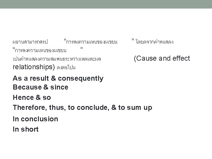 Tim wanted to understand English web sites. He tried to read and listen in English. He used contextual clues, experiences, and an electronic dictionary to help him understand English. After his practice and hard work, he gained a lot of English skills and knowledge. He did very well in English subjects. As a result, he got an “A” in English. . 1เหต (cause). 2ขอมลสนบสนน (evidences) . 3ผล (effect) . 4คำทแสดง “การลงความเหนของผเขยน ” (signal word of conclusion)