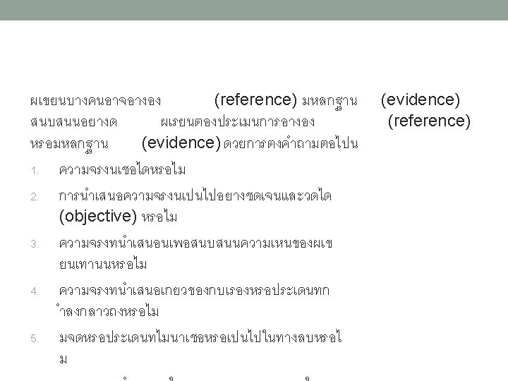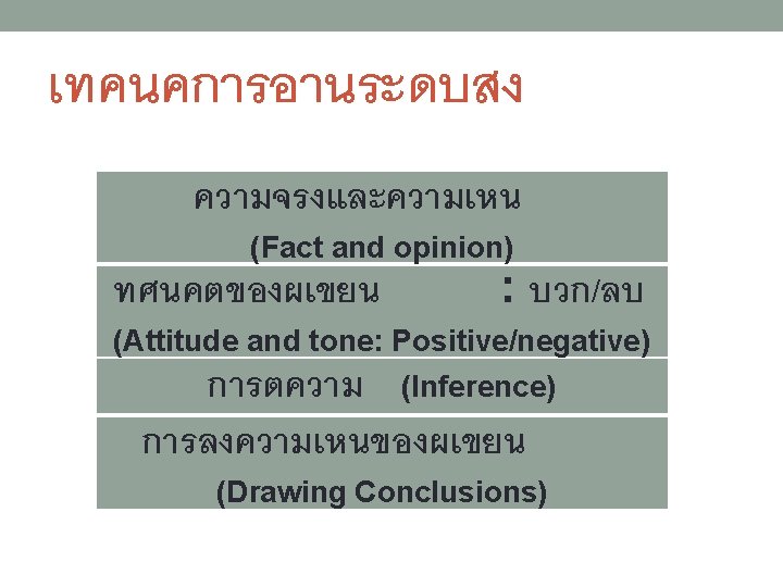 ความจรงและ ความเหน (Fact and opinion) ความเหน (Opinion) เปนการแสดงความคด ความรสก ความเชอ ของผเขยน เปนเรองสวนตวของผเขยน Opinion: believe, consider, find, hope, regard, think, wish, suggest Modal: will, would, shall, should, may, might, ought to Adjective: good, bad, ugly, beautiful, handsome, interest, hate, like Adverb: probably, perhaps, usually, often, sometimes, on occasion As far as I know… , As far as I am concerned…, In my opinion… , In my humble opinion…, In my point of view…