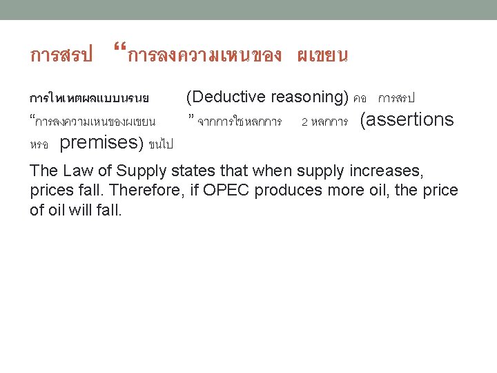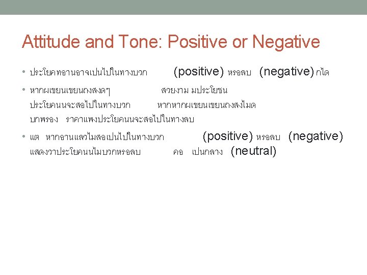 ความจรงและ ความเหน (Fact and opinion) ความเหน (Opinion) เปนการแสดงความคด ความรสก ความเชอ ของผเขยน เปนเรองสวนตวของผเขยน Opinion: believe, consider, find, hope, regard, think, wish, suggest Modal: will, would, shall, should, may, might, ought to Adjective: good, bad, ugly, beautiful, handsome, interest, hate, like Adverb: probably, perhaps, usually, often, sometimes, on occasion As far as I know… , As far as I am concerned…, In my opinion… , In my humble opinion…, In my point of view…