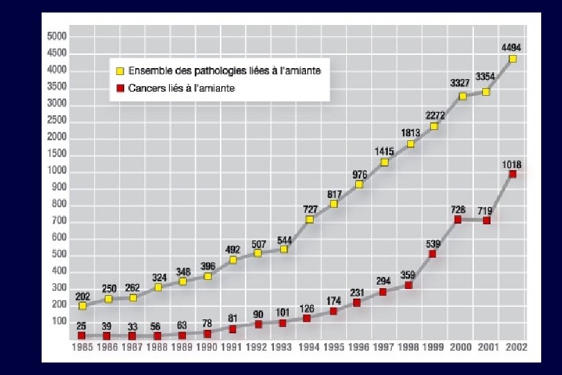 Facteurs professionnels exemples 4% des Cancers • Cancers cutanés les plus fréquents : arsenic, hydrocarbures polycycliques • Mésothéliome : amiante (+ cancers bronchique en synergie avec tabac) • Cancers du foie et polychlorure de vinyle (fabrication de PVC) • Leucémies et dérivés du benzène (industrie pétrolière)