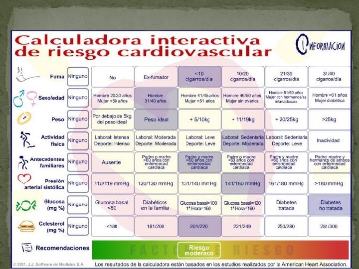 RIESGO CARDIOVASCULAR �Los factores de riesgo cardiovascular: condiciones que se asocian a una mayor probabilidad de sufrir una Enfermedad Cardiovascular: EDAD > 65 HERENCIA COLESTEROL TRIGLICÉRIDOS HIPERTENSION ARTERIAL CONSUMO MASIVO DE ALCOHOL SEXO MASCULINO? ? ? OBESIDAD DIABETES MELLITUS SEDENTARISMO TABAQUISMO SOBREPESO ESTRES ANTICONCEPTIVOS ORALES
