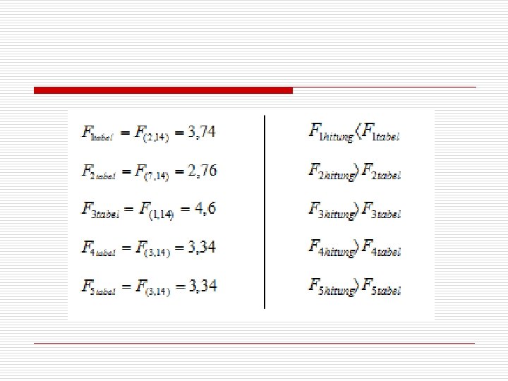Pengambilan Keputusan Untuk menarik kesimpulan (apakah H 0 diterima atau ditolak) digunakan tabel F dengan tingkat signifikansi . H 0 ditolak jika : F 3 > F [ ( r – 1 ) , ( n – 1 ) ( r c – 1 ) ] F 4 > F [ ( c – 1 ) , ( n – 1 ) ( r c – 1 ) ] F 5 > F [ ( r – 1 ) ( c – 1 ) , ( n – 1 ) ( r c – 1 ) ]