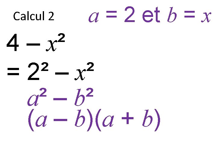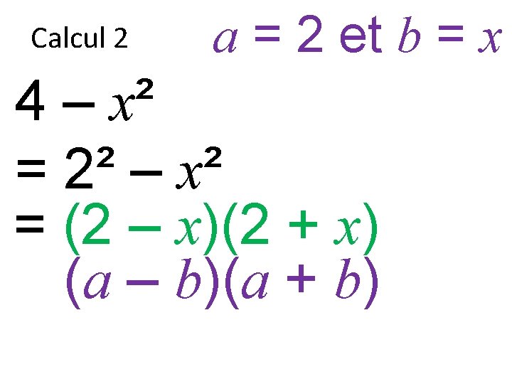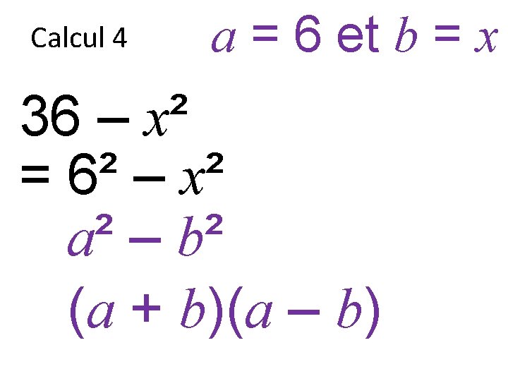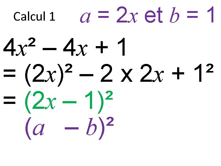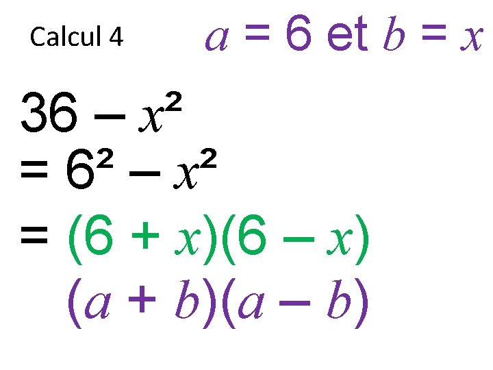 Factoriser 4 x 8 x 4 9 x Slides: 35 Download presentation Factoriser 4 x² + 8 x + 4 = ? 9 x² – 6 x + 1 = ? 16 x² – 1 = ? Calcul 1 4 x² – 4 x + 1 Calcul 2 4 – x² Calcul 3 x² + 12 x + 36 Calcul 4 36 – x² Prêt pour la correction… Calcul 1 4 x² – 4 x + 1 Calcul 1 4 x² – 4 x + 1 = (2 x)² – 2 x 2 x + 1² Calcul 1 a = 2 x et b = 1 4 x² – 4 x + 1 = (2 x)² – 2 x 2 x + 1² a² – 2 x ab + b² Calcul 1 a = 2 x et b = 1 4 x² – 4 x + 1 = (2 x)² – 2 x 2 x + 1² a² – 2 x ab + b² Calcul 1 a = 2 x et b = 1 4 x² – 4 x + 1 = (2 x)² – 2 x 2 x + 1² a² – 2 x ab + b² (a – b)² Calcul 1 a = 2 x et b = 1 4 x² – 4 x + 1 = (2 x)² – 2 x 2 x + 1² (a – b)² Calcul 2 4 – x² Calcul 2 4 – x² = 2² – x² Calcul 2 a = 2 et b = x 4 – x² = 2² – x² a² – b² Calcul 2 a = 2 et b = x 4 – x² = 2² – x² a² – b² Calcul 2 a = 2 et b = x 4 – x² = 2² – x² (a – b)(a + b) Calcul 3 x² + 12 x + 36 Calcul 3 x² + 12 x + 36 = x² + 2 x 6 x + 6² Calcul 3 a = x et b = 6 x² + 12 x + 36 = x² + 2 x 6 x + 6² a² + 2 x ab + b² Calcul 3 a = x et b = 6 x² + 12 x + 36 = x² + 2 x 6 x + 6² a² + 2 x ab + b² Calcul 3 a = x et b = 6 x² + 12 x + 36 = x² + 2 x 6 x + 6² a² + 2 x ab + b² (a + b)² Calcul 3 a = x et b = 6 x² + 12 x + 36 = x² + 2 x 6 x + 6² (a + b)² Calcul 3 a = x et b = 6 x² + 12 x + 36 = x² + 2 x 6 x + 6² = (x + 6)² (a + b)² Calcul 4 36 – x² Calcul 4 36 – x² = 6² – x² Calcul 4 a = 6 et b = x 36 – x² = 6² – x² a² – b² Calcul 4 a = 6 et b = x 36 – x² = 6² – x² a² – b² Calcul 4 a = 6 et b = x 36 – x² = 6² – x² (a + b)(a – b)