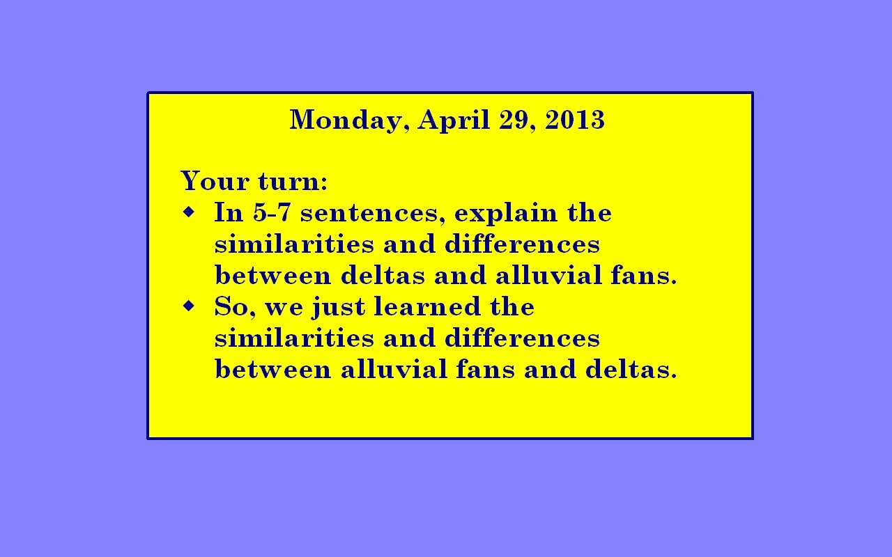 Monday, April 29, 2013 � Objective #2 � You are going to learn the similarities and differences between deltas and alluvial fans