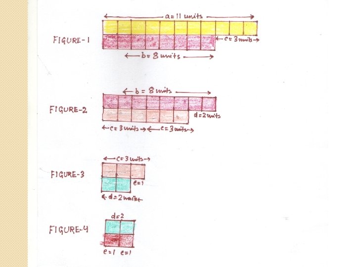 ACTIVITY: � � � � � � By paper cutting method find out the HCF of two numbers. Aim To find the HCF of two numbers experimentally based on Euclid's division lemma. Material Required Square sheet and maths kit. Procedure 1. Cut one strip of length “a” units (a=11 cm) and one strip of length “b” units (b=8 cm) of width 1 cm each (a>b). 2. Paste the strips of length “a” units above the strip of length “b” units aligning them from length as shown in fig 1. The remaining length is say c cm (c=3 cm, b>c). 3. Cut another strip of length b units and 2 strips of c units. Paste the strip of b units above the strips of c unit aligning them from left ad shown in fig 2. The remaining length is say d cm. (d=2 cm, d<c) 4. Repeat the process till the length proceeding strips covered completely and second strip which covers the proceeding strips is the HCF of given number (fig 4). Observation By Euclid's division lemma a=bq+r, 0≤r<b Fig 1. Shows a=b× 1+c (q=1, r=c) Fig 2. shows b=c× 2+d (q=2, r=d) Fig 3. shows c=d× 1+e (q=1, r=e) Fig 4. shows d=e× 2+0 (q=2, r=0) H. C. F. of a and b is e. Here, a=11 cm, b=8 cm, c=3 cm, d=2 cm and e=1 cm H. C. F of 11 and 8 is 1. Conclusion Euclid's division lemma can be used for finding the HCF of two or more numbers.