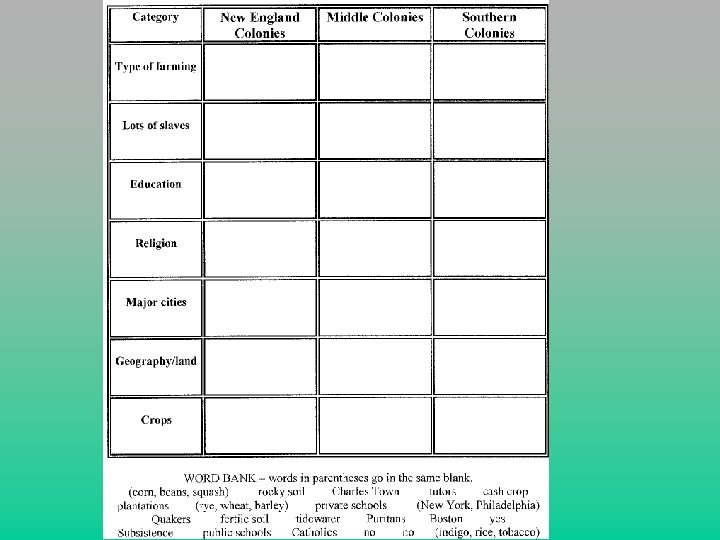 Slavery Terms • Middle passage • Slave trip from Africa to the colonies. Very poor conditions. • Slave codes • Laws limiting the rights of slaves. Slaves were not allowed to read. • Most slaves were found in the Southern Colonies.