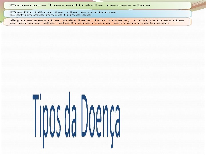 Tipo C Erro no transporte de colesterol exógeno Acumulação intracelular de colesterol não esterificado Sintomas • Afecta principalmente baço, fígado, medula óssea e sistema nervoso; • Normalmente atingem a idade adulta.