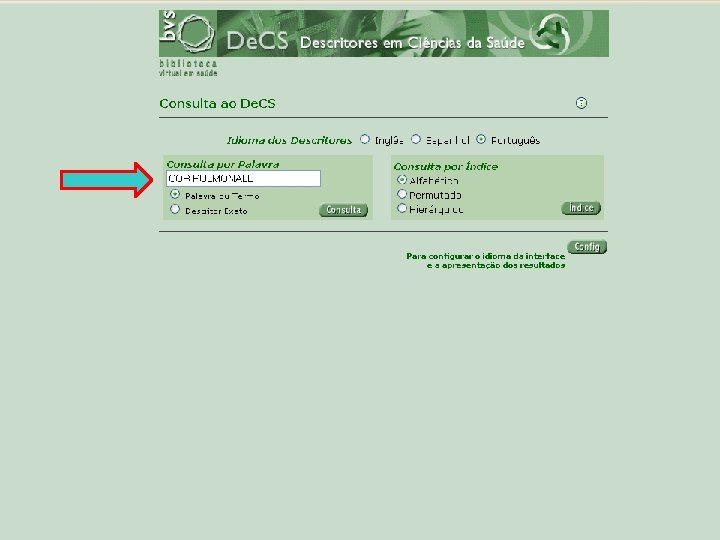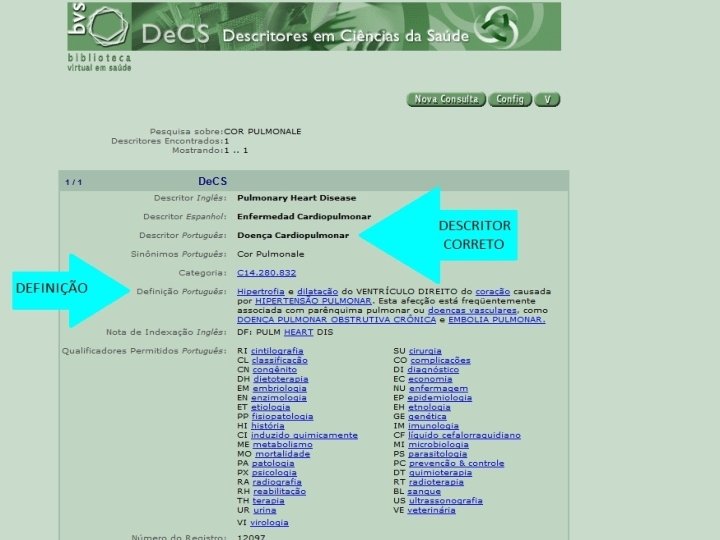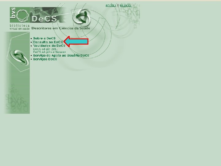 Descritores em Ciências da Saúde (De. CS) n n n Foi criado pela BIREME para servir como uma linguagem única na indexação de artigos, assim como para ser usado na pesquisa e recuperação de assuntos da literatura científica; Possibilidade de encontrar os descritores equivalentes em espanhol e inglês; Garantem acesso à terminologia em saúde com o vocabulário de uso universal.