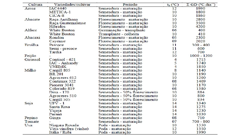 Temperatura do Solo e do Ar Unidades Térmicas de Crescimento: Para as condições do Sul do Brasil em que as temperaturas médias não atingem valores muito elevados, no cálculo de Graus-dia utiliza-se apenas a temperatura base inferior (tb em o. C), não sendo usual a adoção da temperatura de base superior (t. B em o. C) e portanto: Constante térmica = GD Em que: ts é a temperatura média do ar diária ou mensal (°C) e tb é a temperatura base inferior (°C). Portanto, cada grau de temperatura acima de tb teremos um GD. Desta forma, a constante térmica de uma cultura para que ela atinja uma de suas fases fenológicas ou a maturação será dada pelo total de GD acumulados ao longo da fase ou do ciclo.