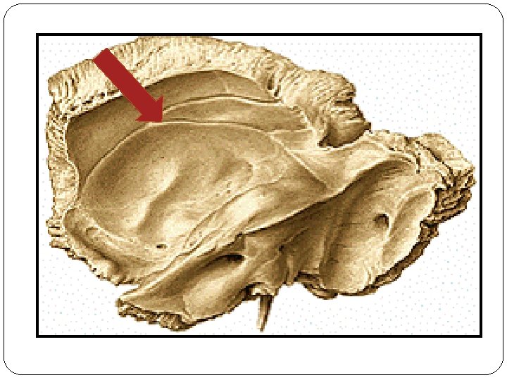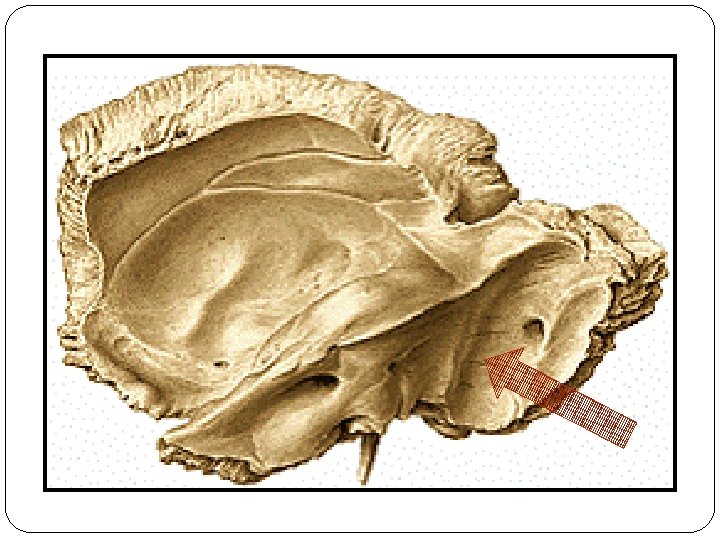 Porción petrosa �Tiene dos caras un borde y un vértice. �Cara anterior -techo del tímpano -eminencia arcuata -hiato de falopio -hiato del conducto para el nervio petroso menor -impresión trigeminal
