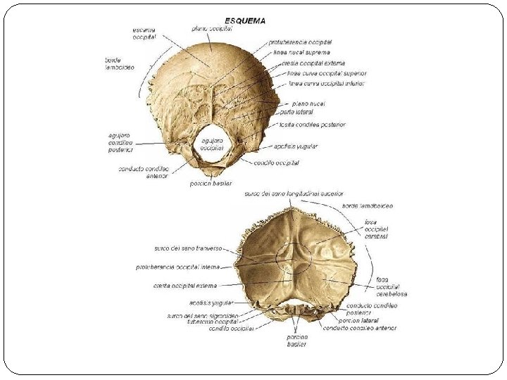 A los lados del foramen magno: • Tubérculo yugular • Orificio interno del N. hipogloso • Surco del seno sigmoideo • Apófisis yugular