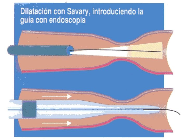 ESTENOSIS ESOFÁGICAS BENIGNAS ESTENOSIS ORGÁNICAS DILATACIÓN CON BUJÍAS Dilatadores de diámetro progresivo (intervalos 1 -2 mm) Ejercen fuerza radial y axial Introducidos sobre guía metálica: Control radiológico Reduce complicaciones (perforación) Calibre inicial variable (según el de la estenosis) Calibre final por sesión: Tres dilatadores tras notar resistencia Alivio de la disfagia con 14 -15 mm Pueden ser necesarias varias sesiones