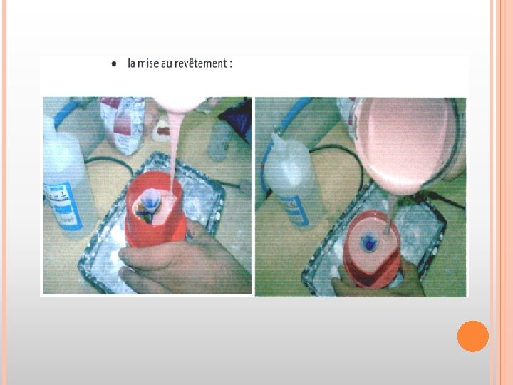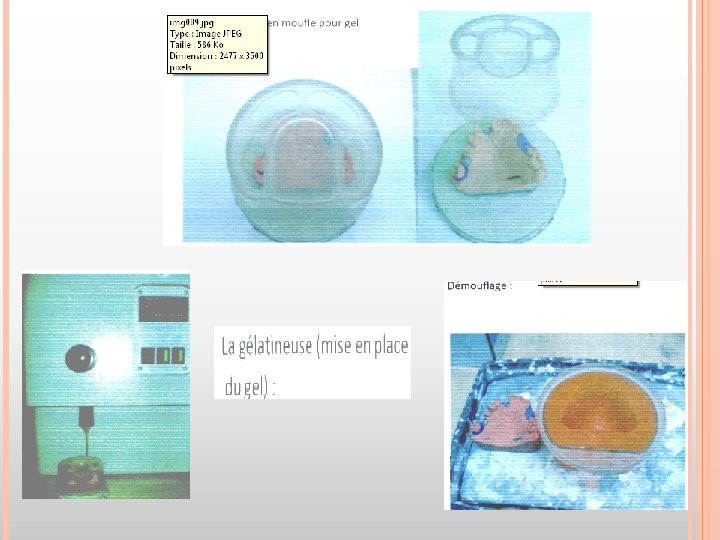 4/LA RÉALISATION DE DUPLICATA Le duplicata est le moulage en revêtement sur le quel va être réalisé la maquette du châssis. Deux matériaux à empreinte peuvent être utilisés: a)La gélatine qu’est particulièrement fiable, mais d’un emploi plus délicat: il s’agit de prendre une empreinte du modèle de travail, le modèle de travail est mis dans un cylindre et la gélatine est coulée à 42°C. après refroidissement de 30 mn le modèle peut être démoulé. b) Les silicones de viscosité fluide, ils sont très précis Après polymérisation, leur rigidité demeure très faible Le modèle peut être extrait de son empreinte à l’air comprimé, sans risque de distorsion.