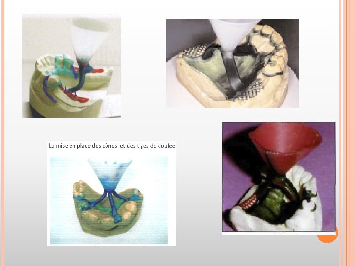 7/LA MISE EN PLACE DES TIGES DE COULÉE De deux à quatre tiges de coulée sont fixées sur la maquette dans les parties les plus épaisses, généralement à la jonction grille armature. Leur diamètre est de 3, 5 à 4 mm, elles sont le plus souvent situées perpendiculairement au modèle La jonction entre la tige et la plaque palatine ou barre linguale doit être vérifiée et arrondie par apport de cire pour éviter tout risque de défaut de fonderie Ces tiges se rejoignent au niveau du cône de coulée La maquette terminée peut être dégraissée avant la mise en revêtement.