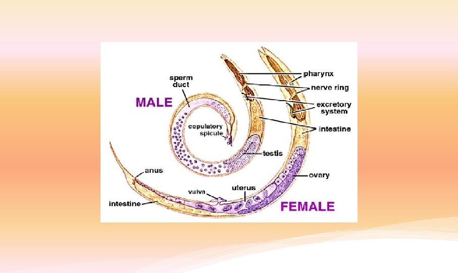 Ascaris lumbricoides Adult (large size ) : Male: has a coiled posterior end, 2 minute spicules and no copulatory bursa – 15 -30 cm in length. Female: oviparous have straight, pointed tail and no spicules. (lay 200, 000 eggs daily) – 20 -40 cm in length. Ascaris adult worms are the largest known intestinal nematodes