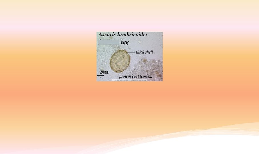 Ascaris lumbricoides is the giant roundworm of human, inhabit small intestine and cause Ascariasis. v Infective stage: Embryonated eggs. v There are three diagnostic stages for Ascaris lumbricoides in stool: adult, Fertilized eggs, Unfertilized eggs. v DUE TO LARVAL MIGRIATION STAGE, Sputum sample may be collected on persons suffering from infection with Ascaris lumbricoid.
