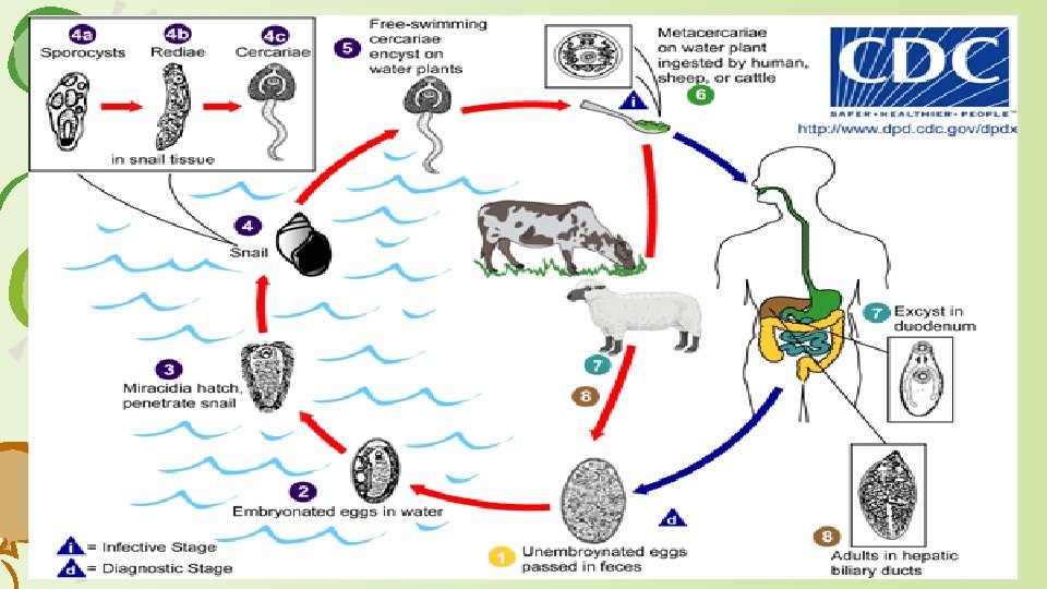 › Fasciola hepatica lives in the liver of man. › Fasciola spp. have many stages: • Oval eggs have miracidium, cercaria, metcercaria, larvae and adult stage. › Intermediate host: Snail. › Definitive host: human. › Infective stage (human): Metacercaria. › Reservoir stage: sheep. › Human infected by ingestion metacercaria from infected sheep. › Diagnosis: • Stool analysis to find Fasciola egg.