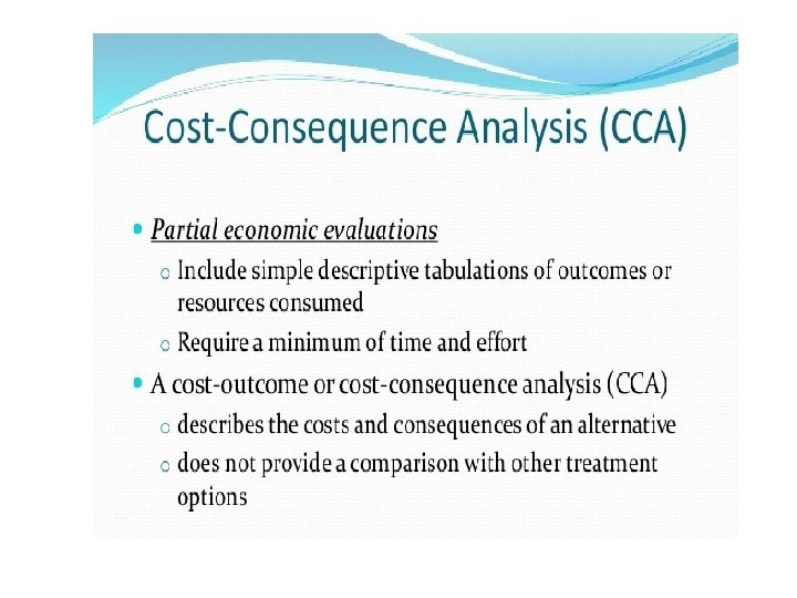Cost consequences analysis � Cost consequences is a form of cost effectiveness analysis comparing alternative interventions or programs in which the components of incremental costs (e. g. , additional therapies, hospitalization) and consequences (e. g. , health outcomes adverse effects) are computed and listed, Without aggregating these results (e. g. , into a cost- effectiveness ratio). � In a cost- consequences analysis, instead of combining the costs and effects, all the costs and outcomes are reported separately.