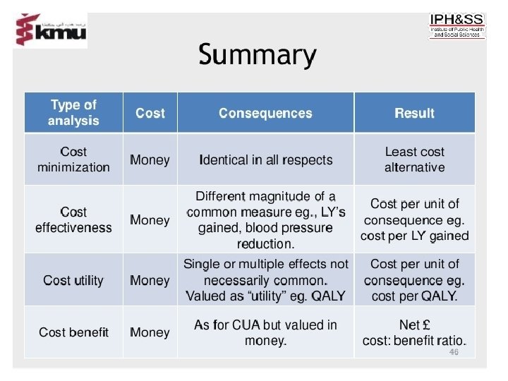 COST OF INTERVENTION OUTCOME CONCERN Cost benefit analysis Monetary units Valued In cash terms Net cost: benefit ratio Cost effectiveness analysis Monetary units Qualitative nonmonetary units eg: reduced morbidity or years of life gained or saved Cost per unit of consequence or cost per years of life gained/saved Cost utility analysis Monetary units TYPE OF ANALYSIS Costminimisationanalysis Valued as Utility Eg: Quality adjusted life year (QALY) Equivalent outcome in all respect Cost per unit of consequence or cost per QALY The least cost alternative